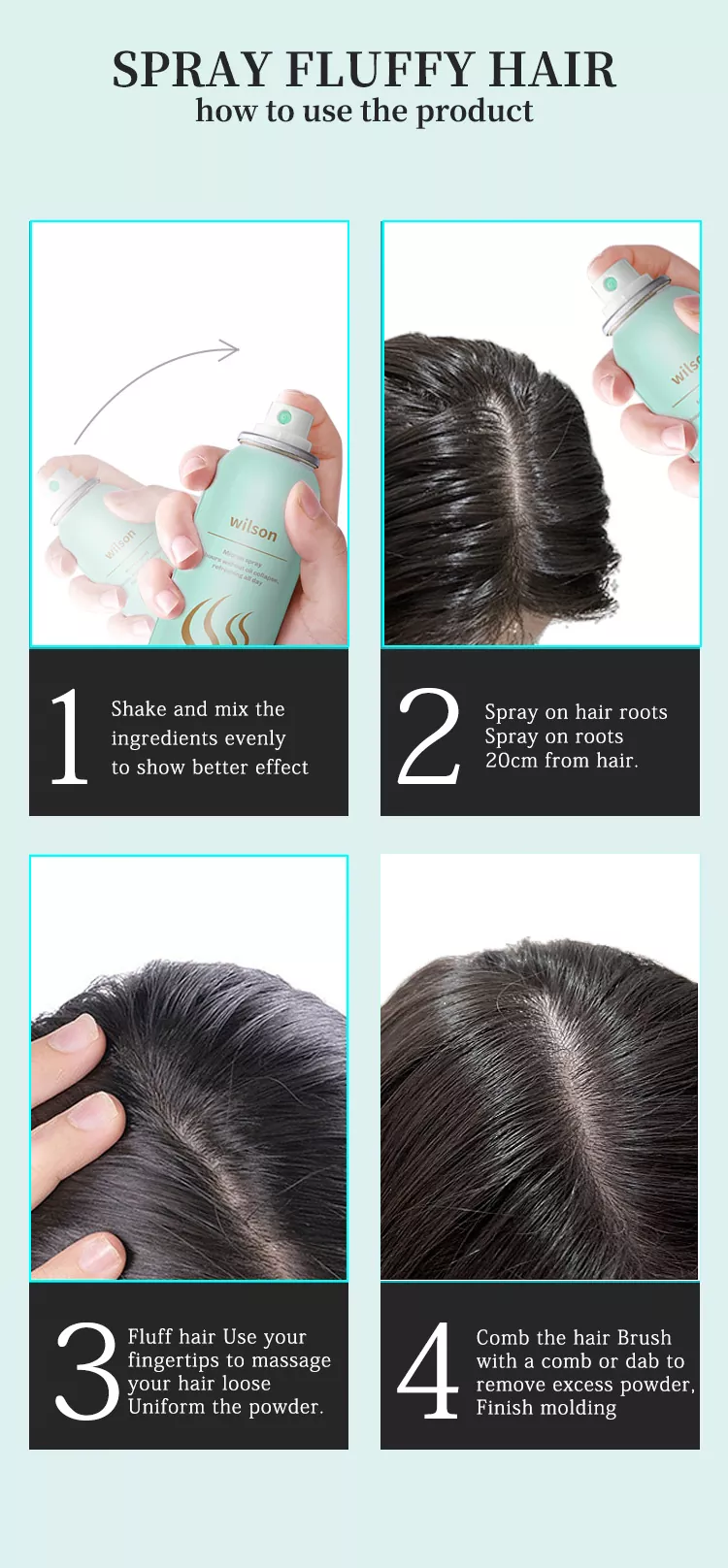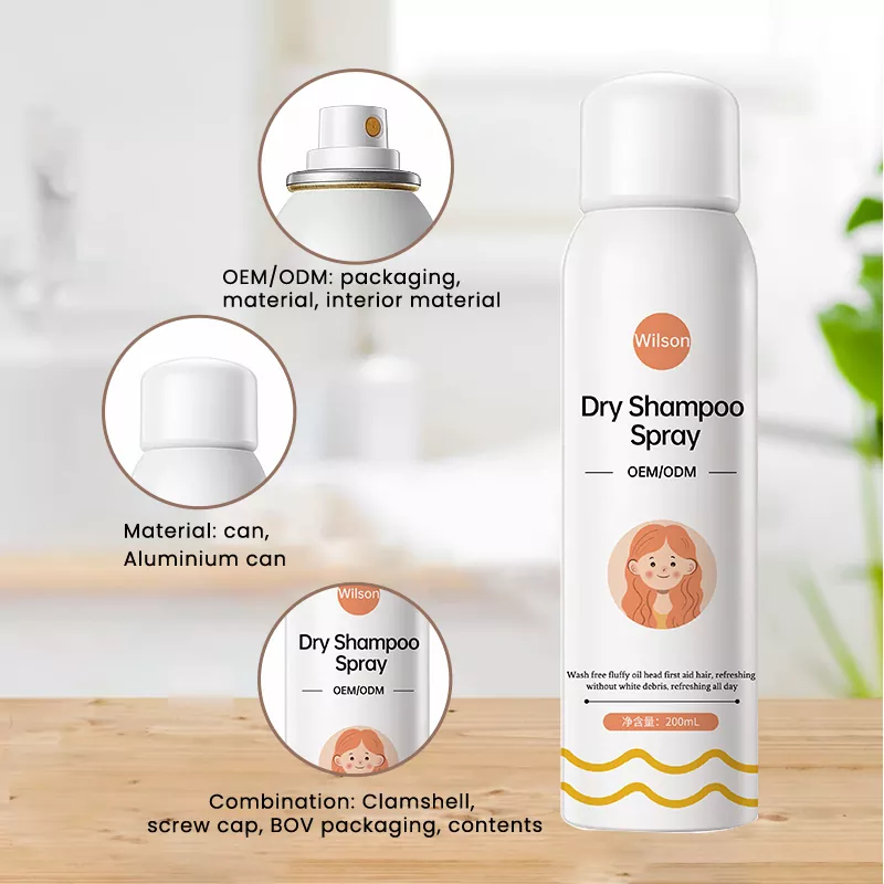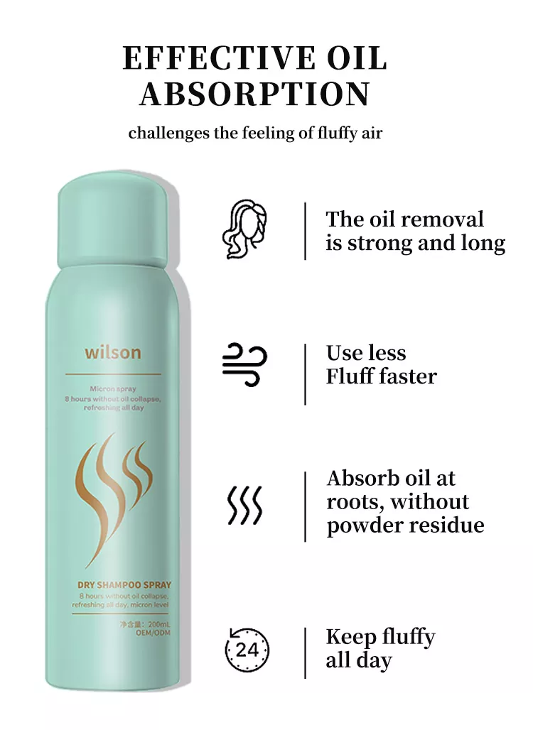 O spray de shampoo seco e fresco sem lavagem Wilson Instant resgatou muitas cabeças de óleo que saem temporariamente, não podem lavar o problema do cabelo, a principal matéria-prima é o amido de arroz, o amido tem estrutura porosa, adsorção, é uma matéria-prima de adsorção higroscópica comum, pode efetivamente absorver o excesso de óleo no couro cabeludo e limpar a sujeira do cabelo, borrifar e adicionar alguns surfactantes e componentes eletrostáticos para facilitar a remoção de produtos do cabelo. Sinta-se fresco e natural após o uso.