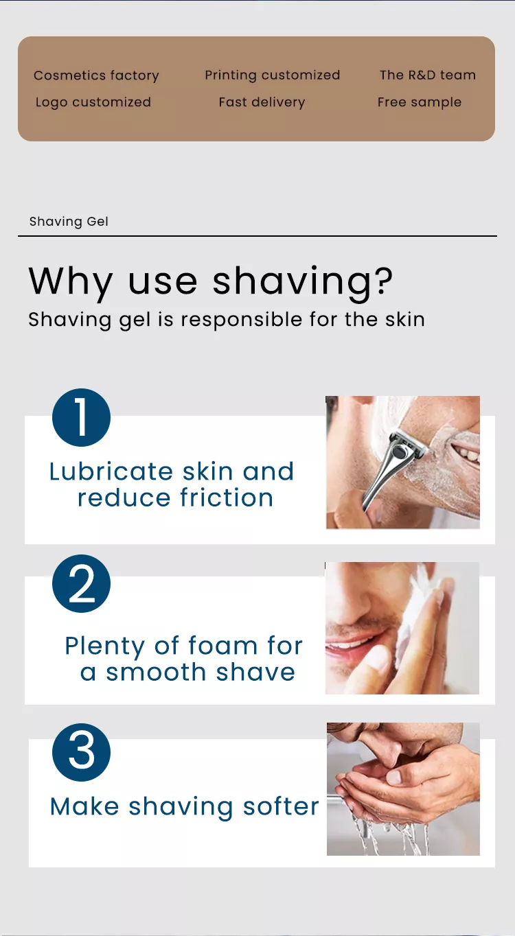 O gel de barbear é um cosmético usado ao barbear, geralmente o creme de emulsão de óleo em água, dividido em tipo de espuma e não espuma tipo dois, a barbear gelGeneralmente usa a emulsificação tradicional à base de sabão, é o sistema de dispersão de sabão de metal alcalino em glicerol e água.